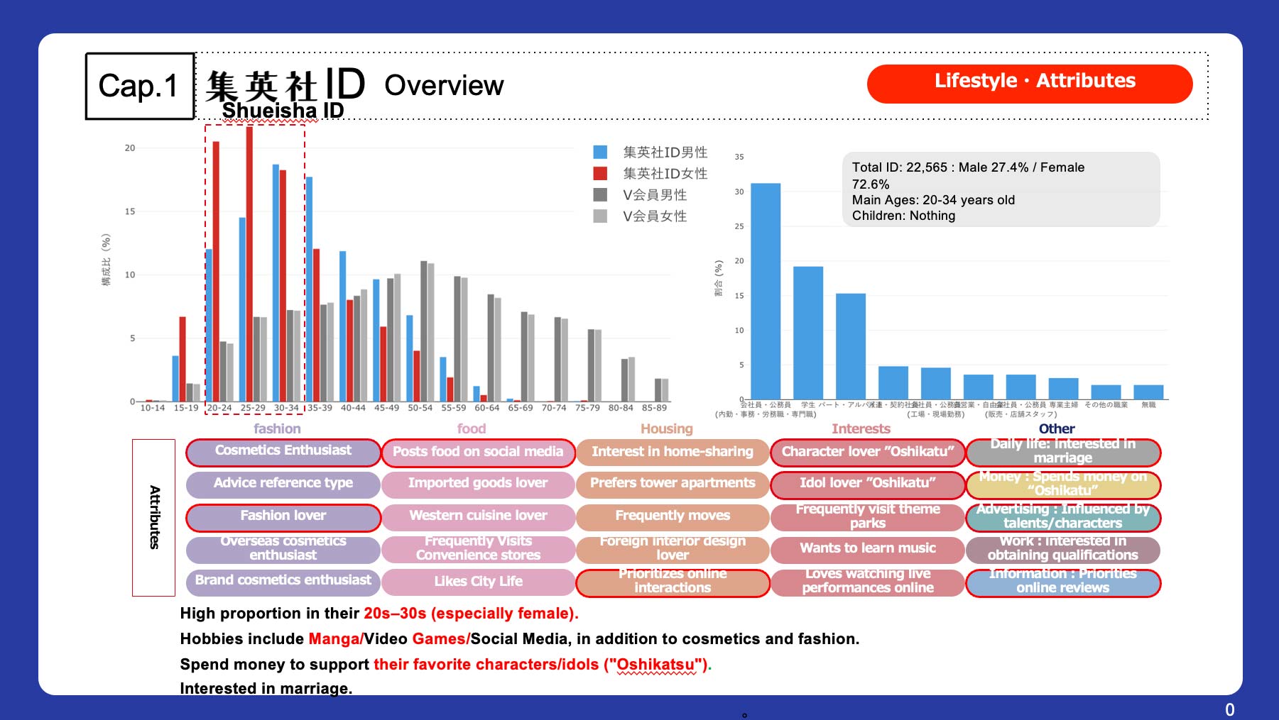 AIは、集英社IDユーザーの全体的な属性を整理し、そのなかでも「ゲームへの関心が高い」「推し活に関連する消費が多い」といった傾向を示唆する。さらに、購買データを品目単位で把握することも可能で、例えばお菓子や菓子パン類では、IPとコラボレーションした商品が頻繁に購入されているといった実態も確認された。