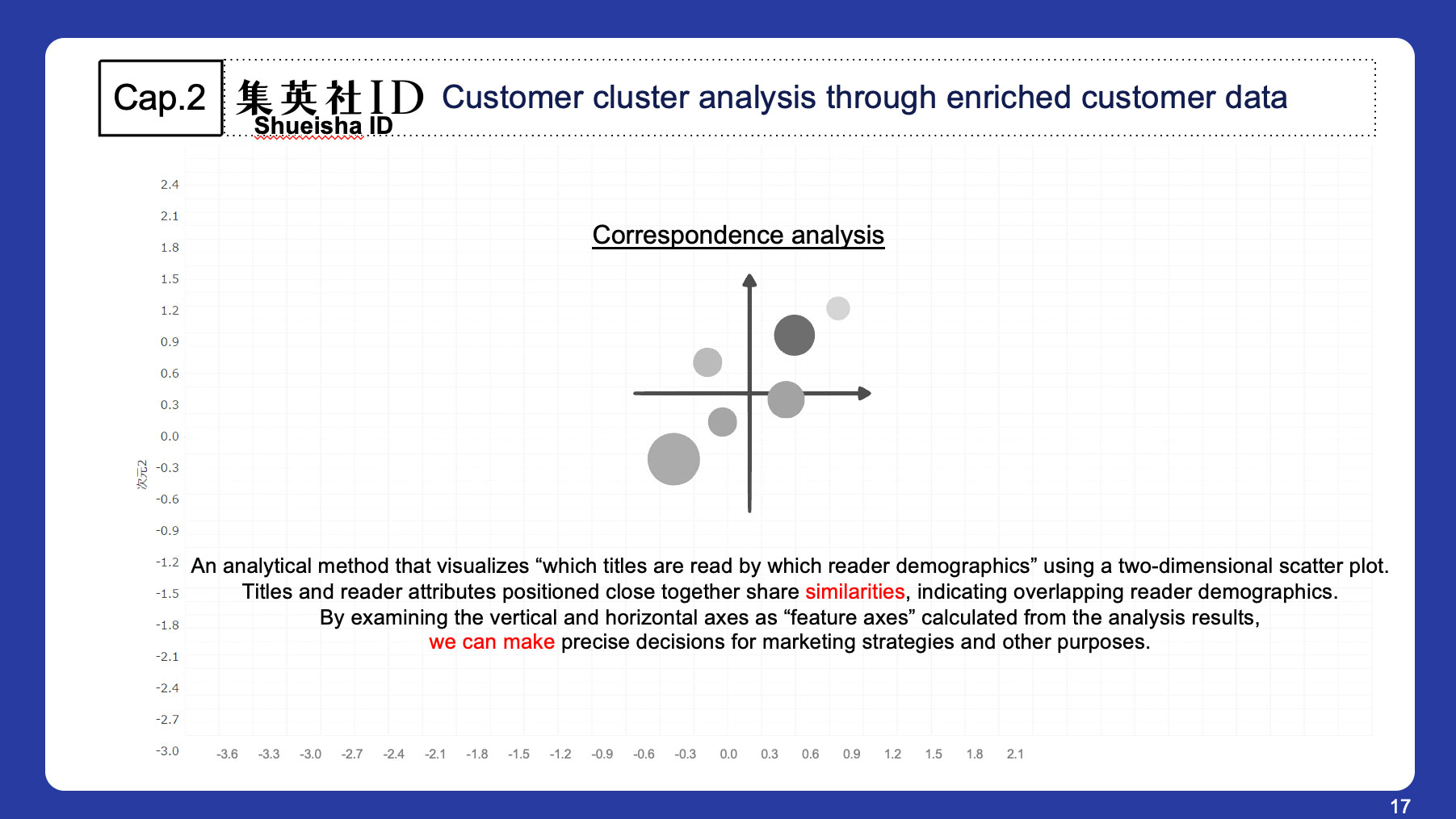 続いて石塚氏は、より踏み込んだ顧客理解の手法として「コレスポンデンス分析」の事例を紹介した。分析対象同士の相対的な距離を二次元のグラフ上に表現する手法で、膨大な読者データをもとに、作品ごとの関係性を可視化するものだ。