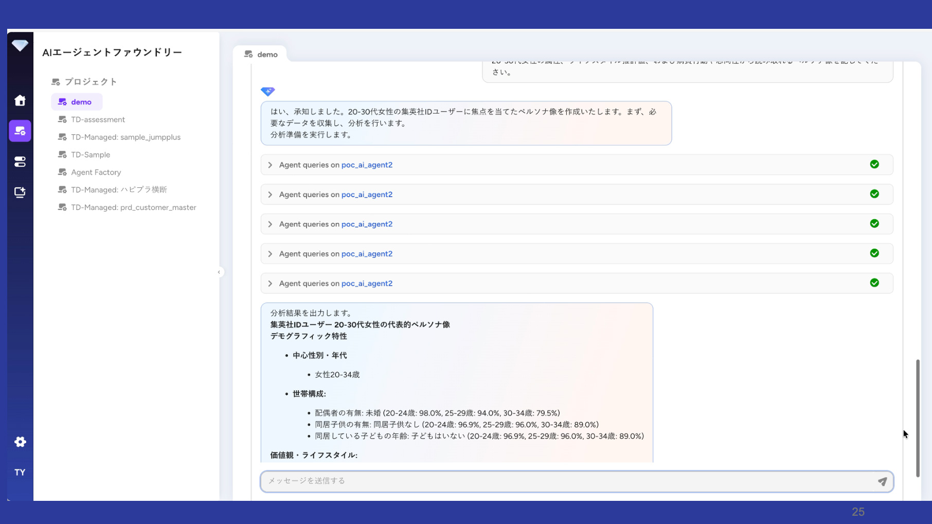その結果、日用品やファッション、推し活関連の商品、さらには他社出版社の作品に至るまで、幅広い購買データを自社の顧客IDとひも付けて取得できるようになった。しかし、データの量と粒度が増したことで、集計や分析を行い、顧客理解につなげていく作業は容易ではない。そこで石塚氏は、Treasure Data CDPのAIエージェントファウンドリーを活用し、課題の解決を試みた。