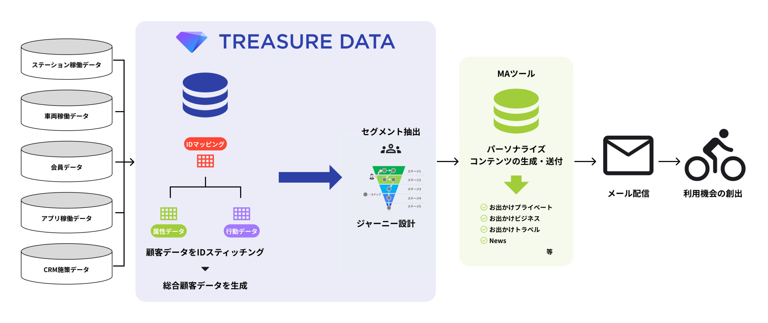 同社は、アプリから取得したデータをTreasure Data CDPに格納し、カスタマージャーニーオーケストレーションを運用する。利用時間や利用ステーションなどのデータから、ユーザーの行動の傾向を類推してセグメントとシナリオを作成、CRMツールを介してユーザー向けのメールを配信している。