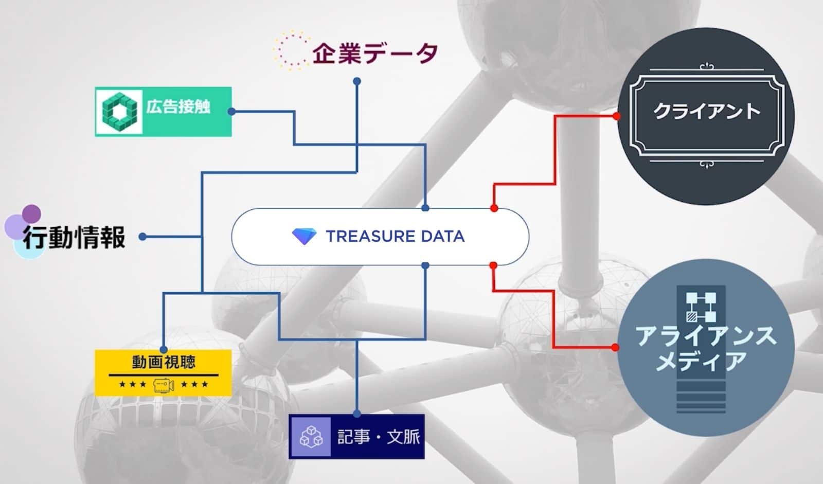 一番の目的は「広告主に対してより高度なマーケティングサポートを提供する」ことです。具体的には、メディアでの記事閲読などの行動情報に「広告接触の情報」「動画の視聴情報」「外部から購入している企業データ」などを統合してTreasure Data CDPに入れて管理をしています。