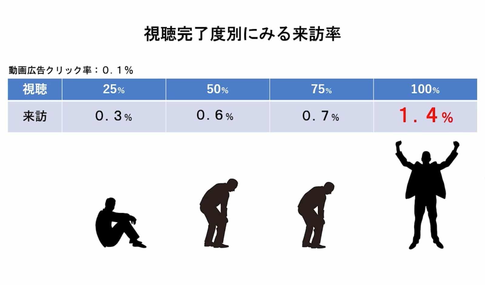 また、75%視聴と50%視聴ではそれほど差はありませんでしたが、100%視聴になると来訪率が1.4%と飛躍的にジャンプアップすることがわかりました。つまり、このクリエイティブに関していえば、いかに100%視聴してもらうことが非常に重要なファクターになってくると考えています。