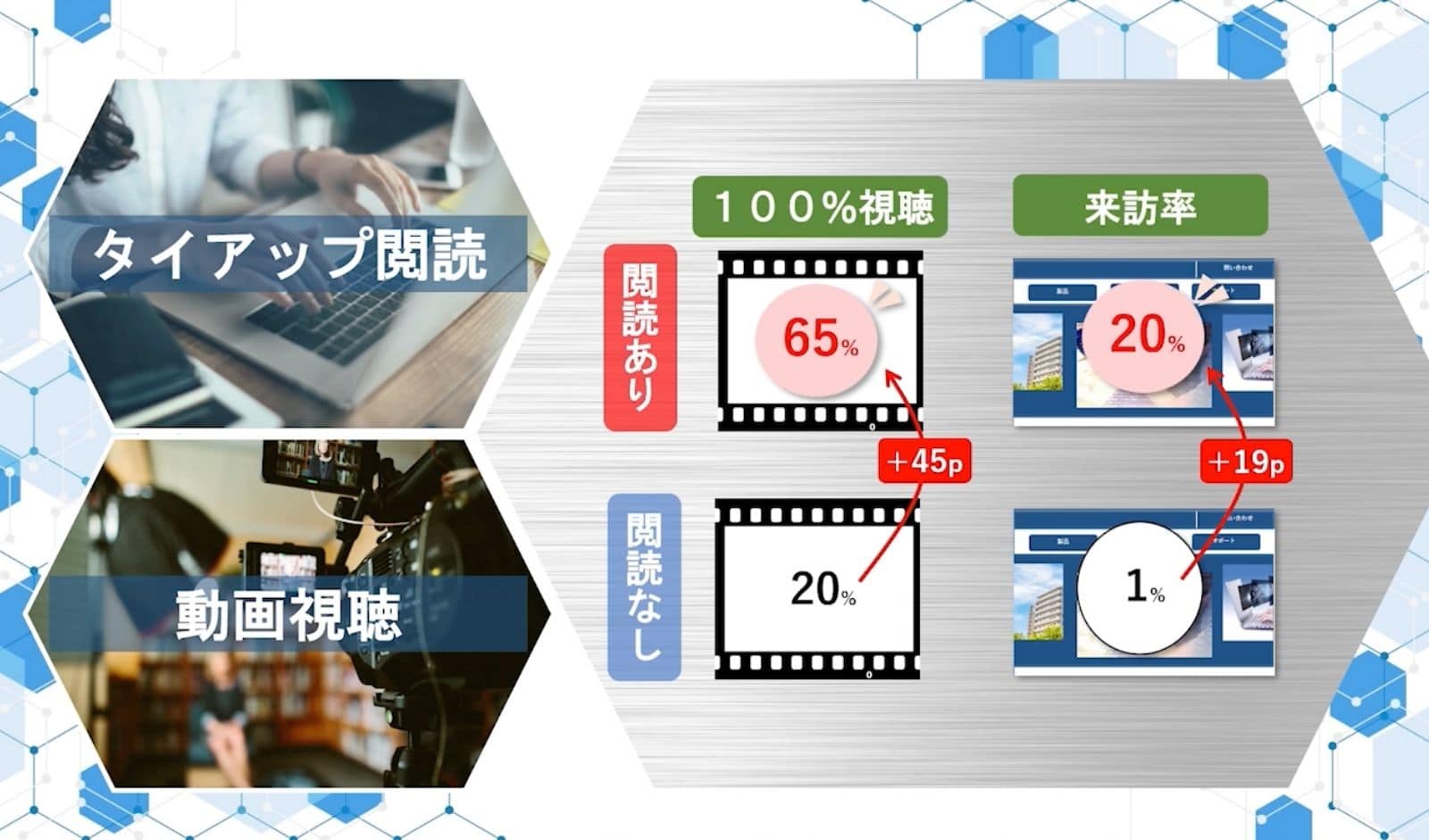 タイアップ記事を閲読して動画を視聴したユーザーと、タイアップ記事を閲読せず動画広告のみに接触してるユーザーで「視聴完了率」と「クライアントサイトへの来訪率」を比較しました。結果を見てみると、タイアップ記事を閲読したユーザーは動画を100%視聴してくれる割合が65%サイト、来訪率も20%と圧倒的に高まっているのがわかりました。