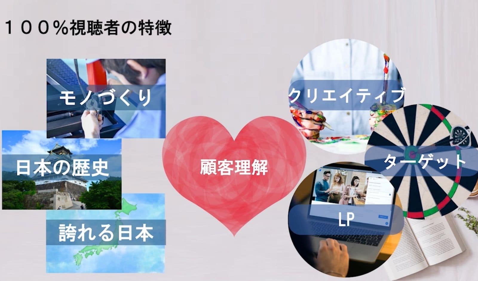 そこで、100%視聴してくれる人達のインサイトや特徴を知るために「100%視聴してる人」と「視聴してない人」に分けて メディア内の行動の違いを導き出しました。その結果、100%視聴してくれる人たちの特徴として 「モノづくり」の記事や 「日本の歴史」や「世界に誇れる日本人」といった記事を読んでることがわかりました。