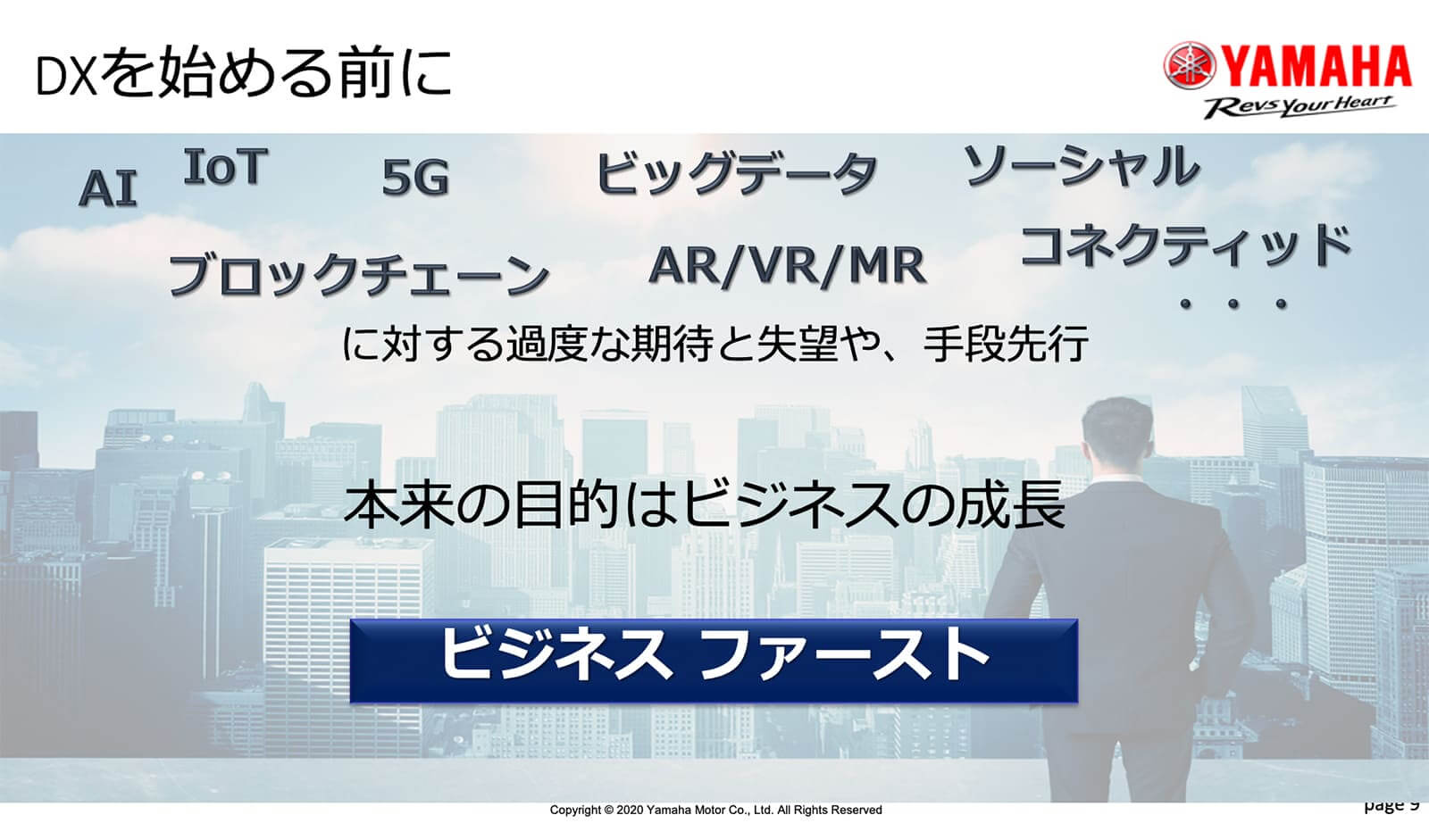 まず大西氏は、これまでヤマハ発動機がどのような方向性のもとDXを推進してきたのかについて解説した。大西氏は、「ヤマハ発動機はDXに取り組む目的はなにかを重視して考えてきた」と強調。テクノロジーや手段にばかり目を向けて目的を不明瞭にするのではなく、ビジネスの成長を最大の目的に掲げてDXを推進してきたという。「DXは過度な期待と失望を起こしやすい。アジャイルに何でもできてしまうことから、手段が先行しやすい。ビジネスファーストでDXを推進していくことが非常に重要だ」(大西氏)。