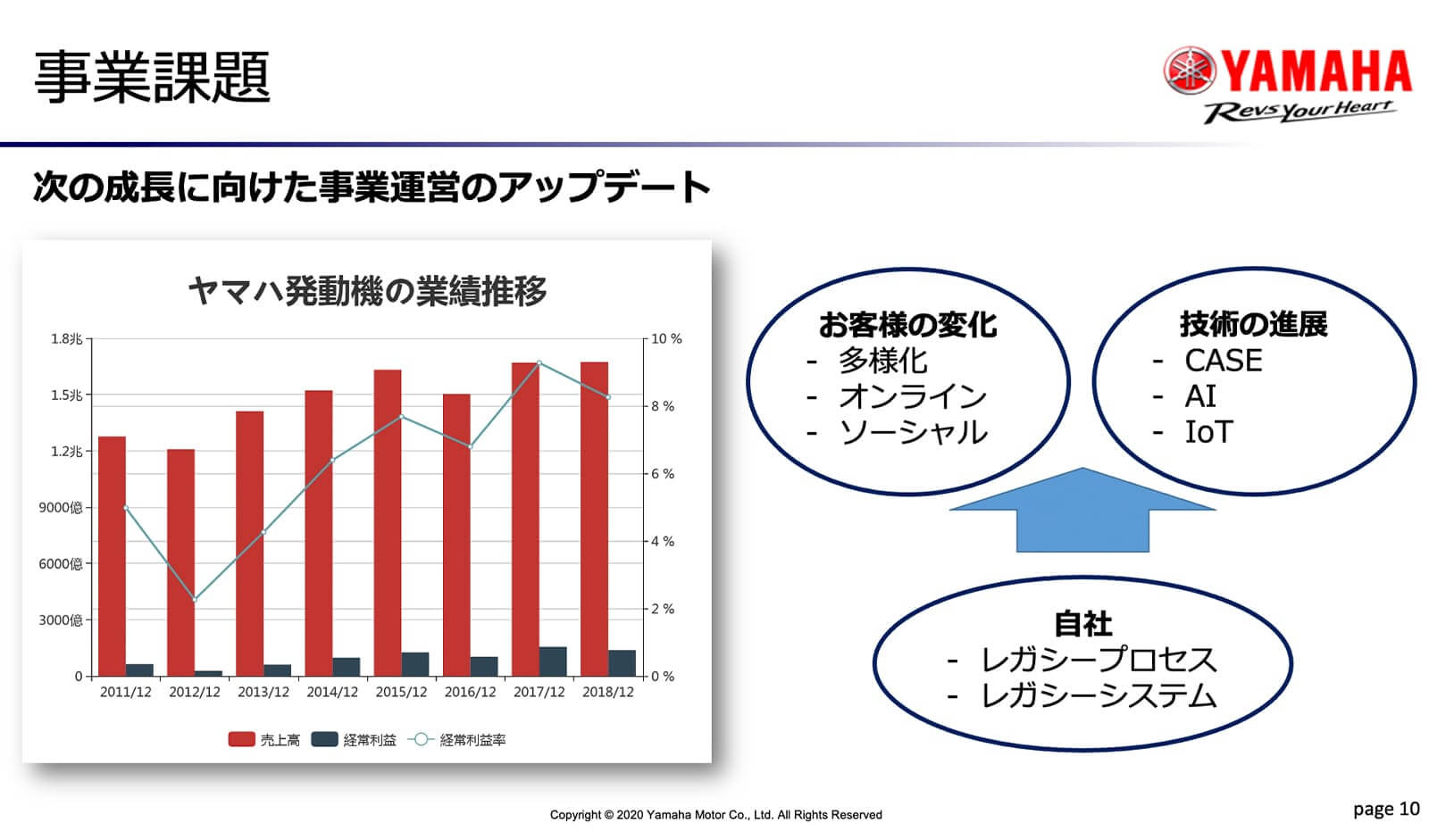 では、DX前夜のヤマハ発動機にはどのようなビジネス上の課題があったのか。それを一言で表現すると、レガシーなビジネスプロセス、レガシーなシステムを運用してきたヤマハ発動機の現状を、顧客のニーズやタッチポイント、そして世の中の技術進化に合わせて最適化していくというものだ。「近年の企業業績を見ると堅調に推移しているものの成長率は鈍化しているのが現状。次の成長に向けた事業運営のアップデートがDXの大きな目的だ」と大西氏は振り返る。