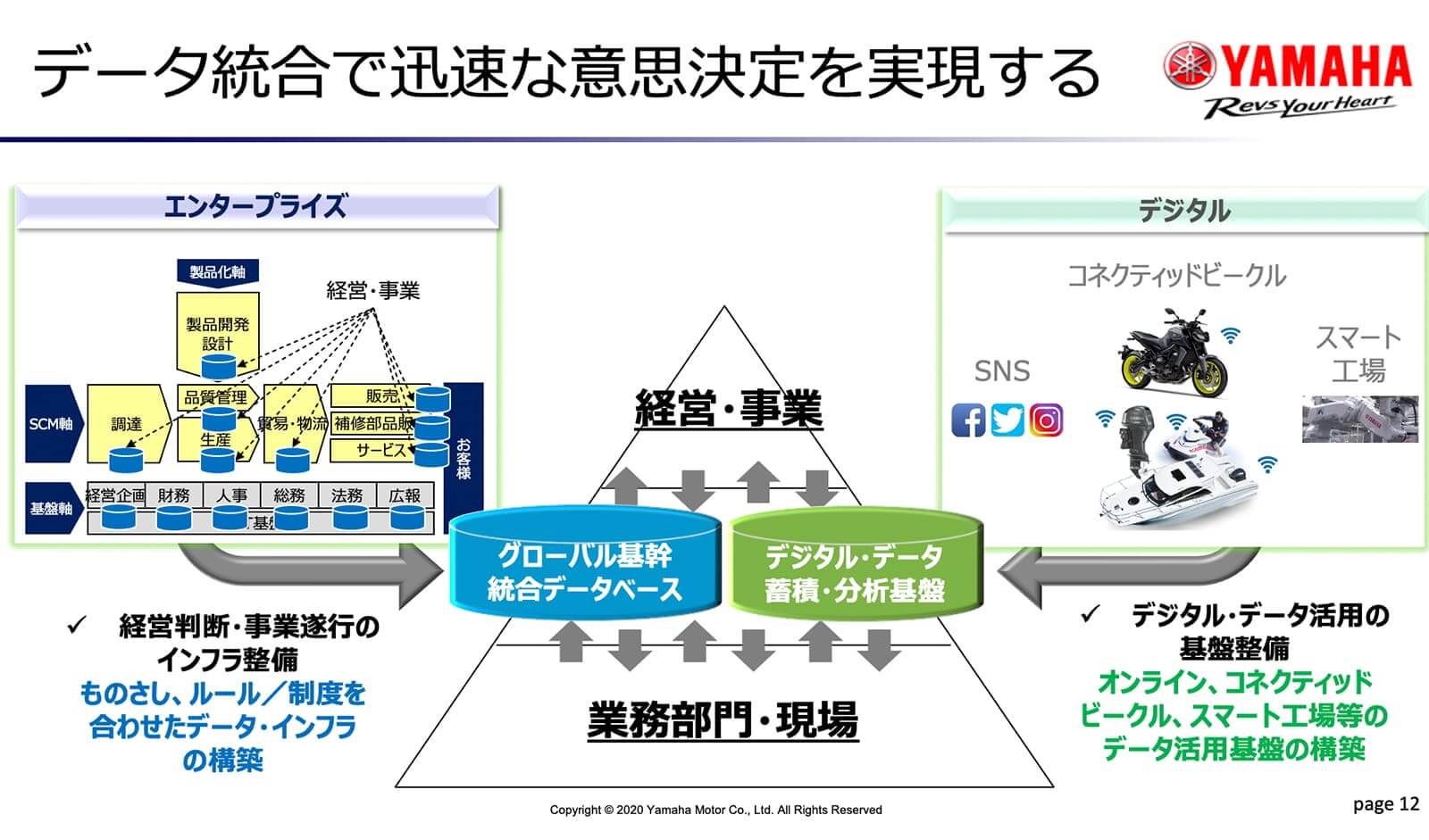 大西氏によると、ヤマハ発動機では調達から生産、貿易・物流、販売・サービスに至るまでの業務プロセスやバックオフィス業務などが生み出す「エンタープライズ系データ(システム・オブ・レコード)」と、オンラインにおける顧客コミュニケーション、コネクテッドビークル、スマート工場などが生み出す「デジタルデータ」に大きく分類。特に、近年急速に増えているデジタルデータはしっかり統合・活用できる基盤の構築ができていなかったため、「これを利活用できるデータ基盤をしっかりと構築し、経営や業務の現場で活用できる環境を整えることが重要だと考えた」と大西氏は振り返っている。