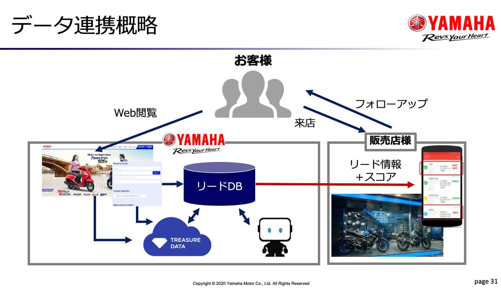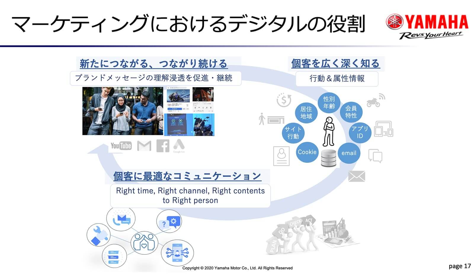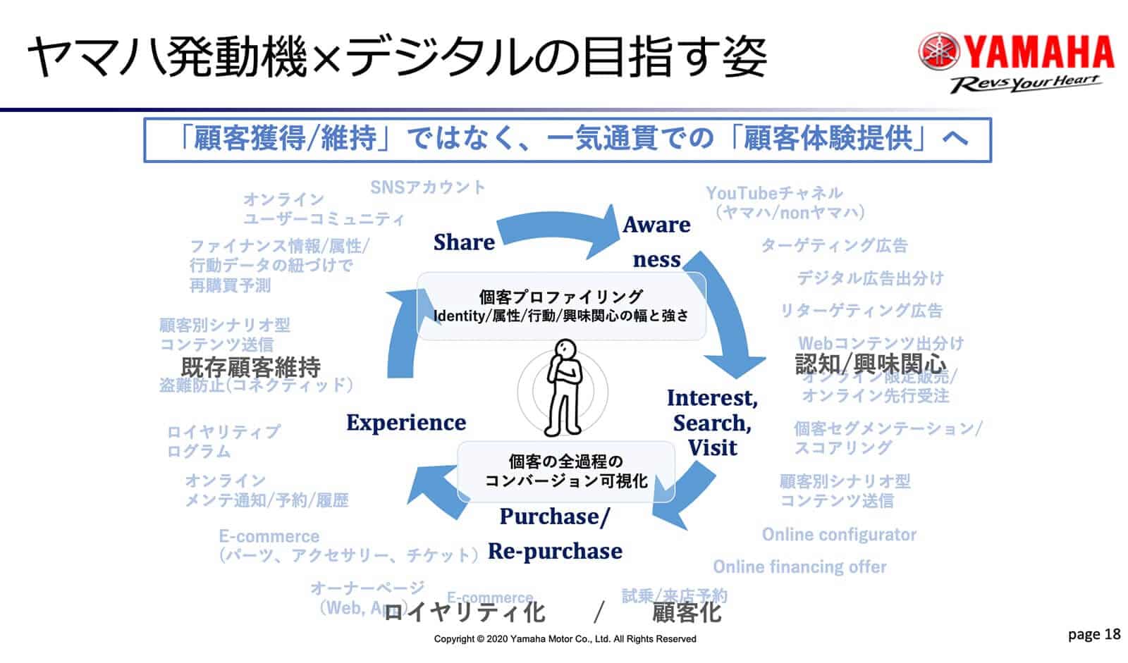 「認知、興味関心、来店・購買、経験、共有という一連の流れのなかで顧客ひとりひとりにあった体験を提供することで、ヤマハ発動機のことをもっと好きになってもらったり、再びヤマハ発動機の製品を購入してもらいたい。その体験を生み出すためには、顧客のプロファイリングが重要な役割を果たすと考えた」(大西氏)
