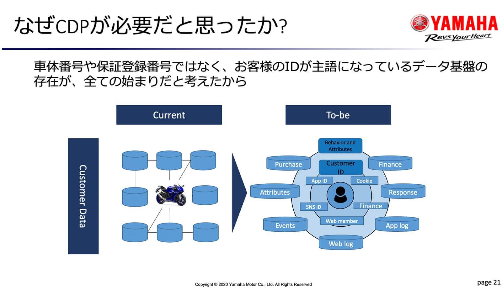 このような背景から、同社では2018年7月にトレジャーデータの顧客データ基盤「Treasure Data CDP」を導入している。ではなぜ、DXを推進する上でCDPを必要としたのか。大西氏は「車体番号や登録番号(など製品の軸にしたデータ)を主語にしたデータではなく、顧客IDが主語になっているデータ基盤が存在していなかった」と振り返る。社内に散在するデータを、主語を顧客IDにしたものに切り替えていくことからデータ基盤の構築を行い、社内のマインドセットを変えていくことを始めたのだ。