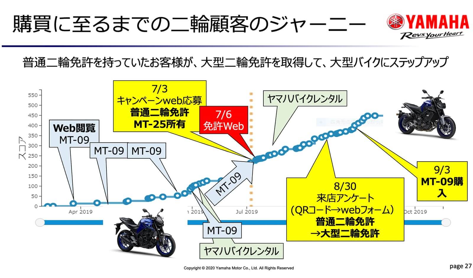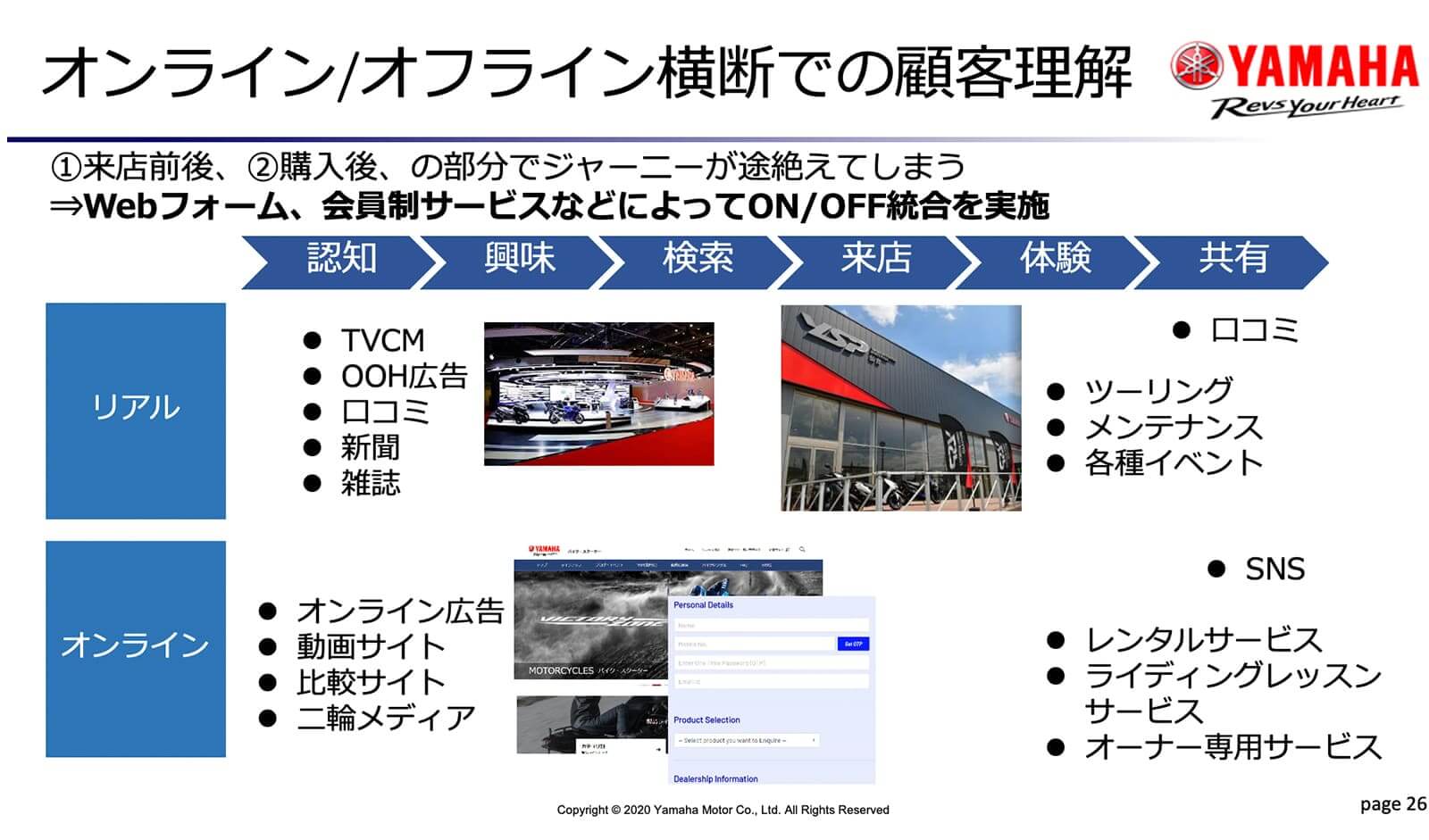 オンラインでの行動理解が可能になったところで、次のステップはオンライン、オフラインを統合した顧客行動の理解だ。オートバイなどの商品は、カスタマージャーニーの中で顧客がオンライン(Web閲覧)とオフライン(来店・試乗など)を頻繁に行き来する。その行き来でカスタマージャーニーの分断が起きないように、来店予約をウェブでできるようにしたり、会員制サービスの拡充などに取り組んだ。