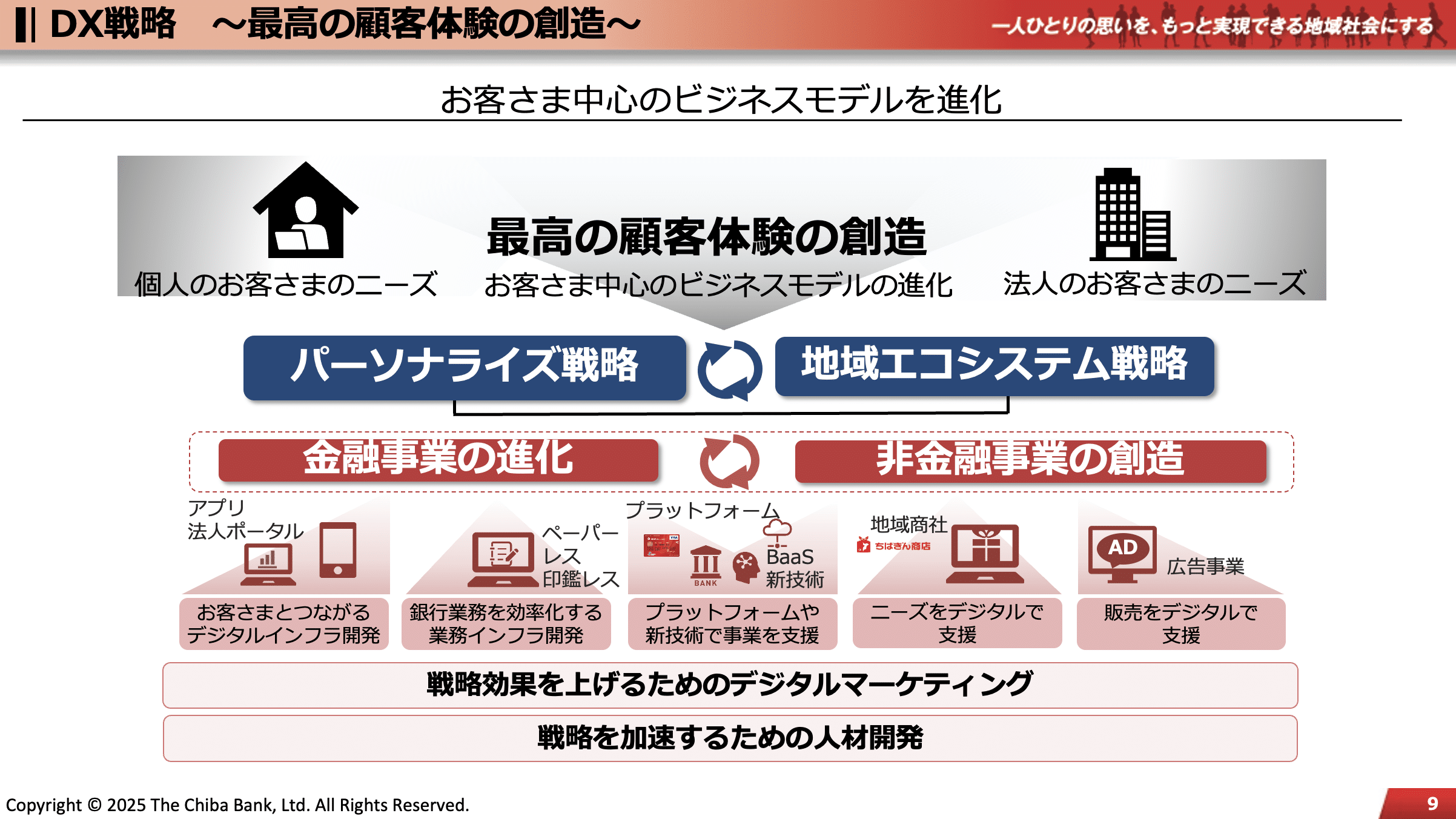 DX戦略として立案したのは、大きく2つ。1つは、一人ひとりの顧客に最適な提案を届けるパーソナライズ戦略。もう1つは地域の事業者と個人をつなぎ、経済循環を活性化させる地域エコシステム戦略だ。それらを実現するために、デジタル資源の獲得や人材育成などを進めている。
