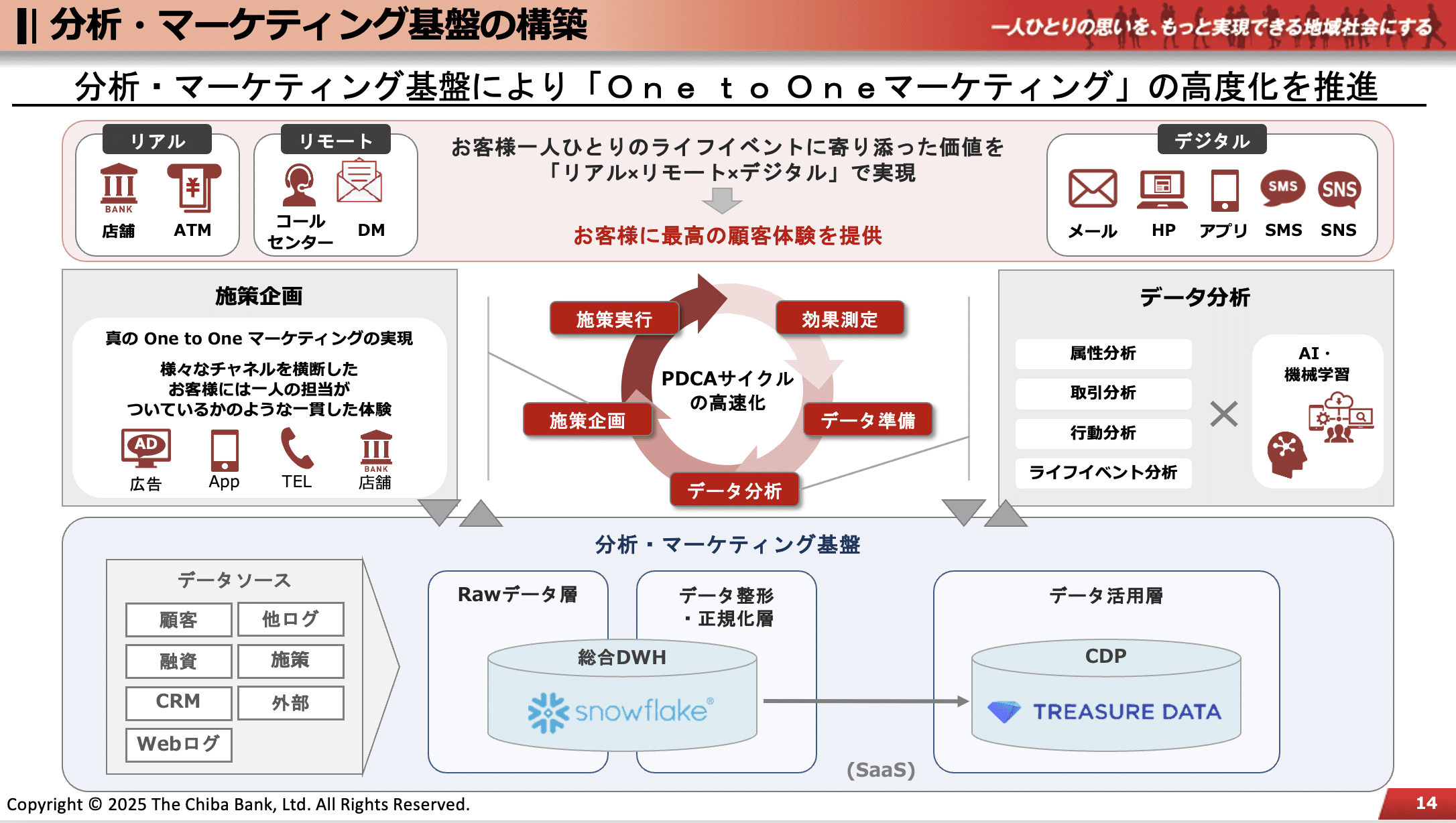 地方銀行として千葉市に本店を構える千葉銀行は2025年3月、「最高の顧客体験の創造」を目指して、NTTインテグレーションの支援を受けながらTreasureData CDPを導入し、データ分析・マーケティング基盤を構築した。