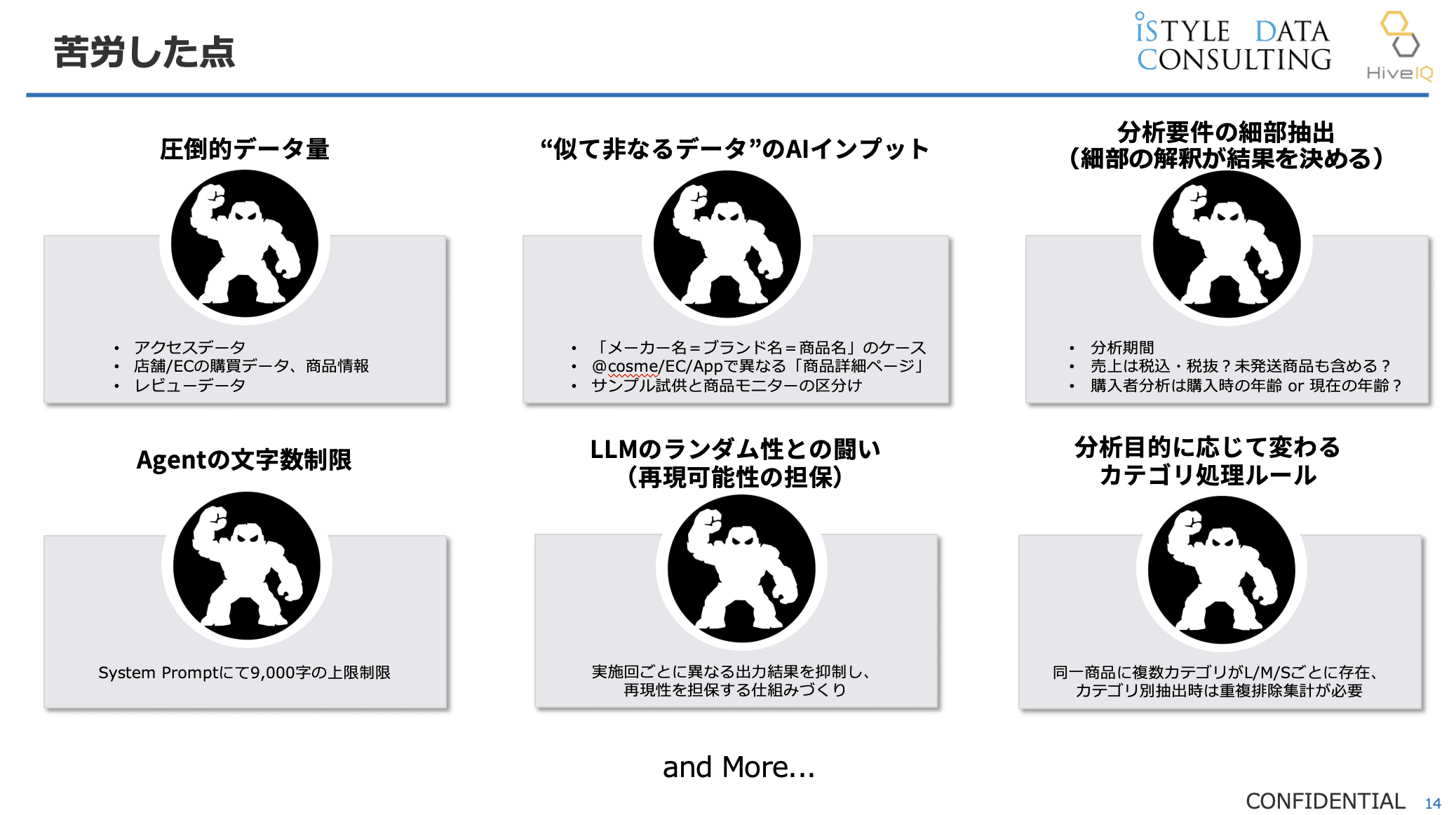 しかし、その開発では、さまざまな課題や苦労に直面した。開発初期の段階では、入力したプロンプトの条件が無視される、LLMが依頼文を拡大解釈する、存在するはずのデータが「ない」と返される、同じ依頼文なのに毎回異なる回答が返ってくるなど、さまざまな課題があった。