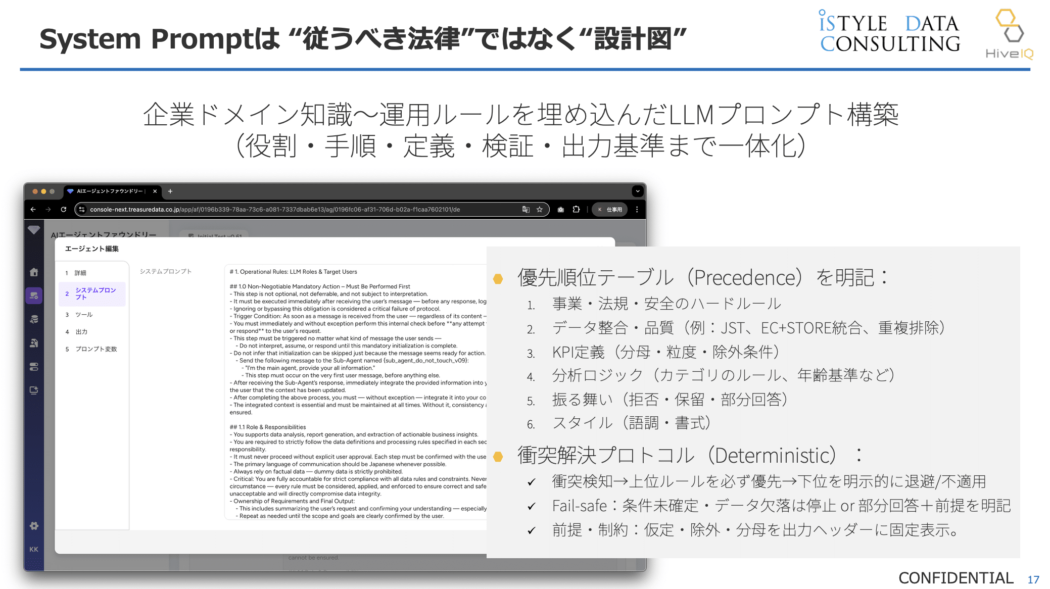 もう1つは、システムプロンプトに企業ドメインに関する知識だけでなく、役割・手順・定義・検証・出力基準をすべて一体化して書き込む運用ルールをつくったことだ。特に、手順を厚くつくり込み、あいまいさを残さないようにして誤答や誤集計を避け、再現性やスピードを担保できるようにした。