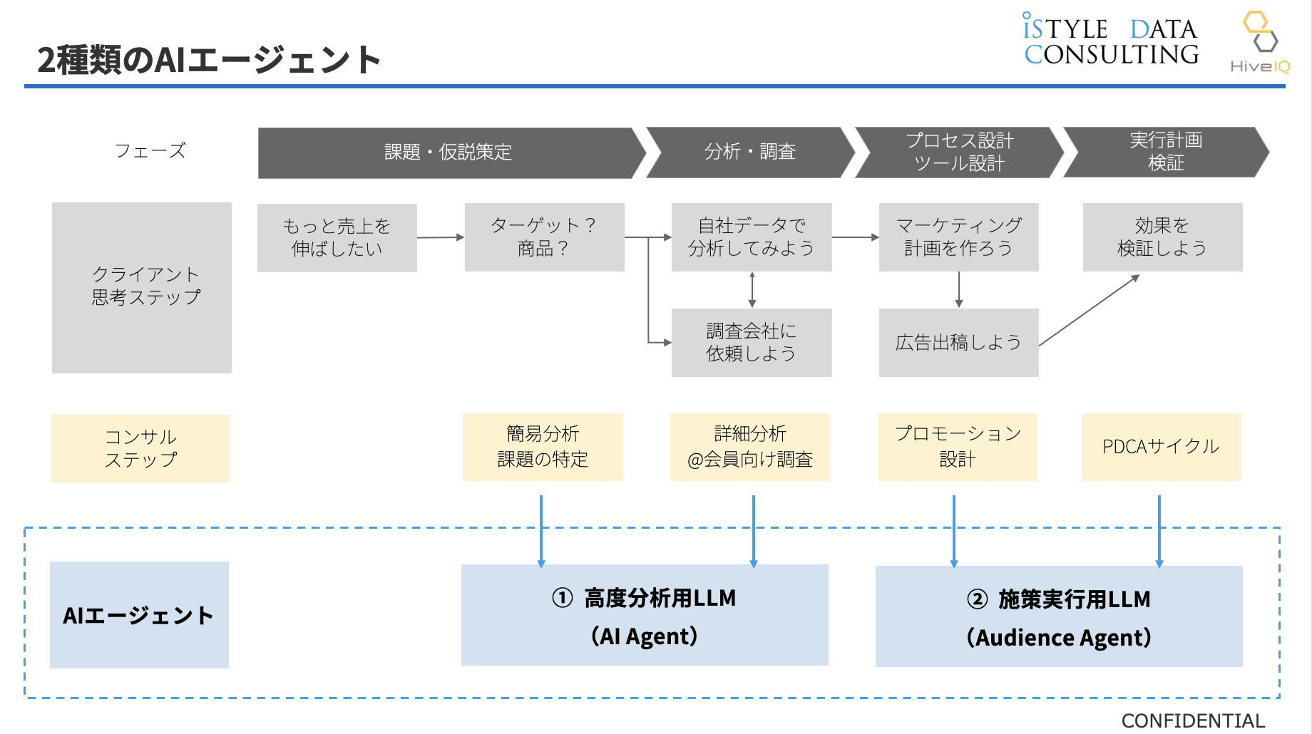 ハイブアイキューと連携し、分析用と施策実行用の2種類のAIエージェントを開発した。