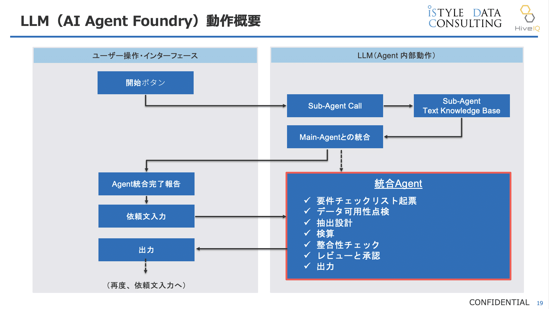 完成したAIエージェントは、ユーザーが開始ボタンを押下すると、エージェント内部でサブエージェントを呼び出し、メインエージェントと統合。統合エージェントがセットアップできたらユーザーは依頼文を入力できるようになり、要件チェックリストの起票やデータ可用性点検、抽出設計、検算、整合性チェック、レビューを経て、最終的な出力に至るというワークフローとなっている。