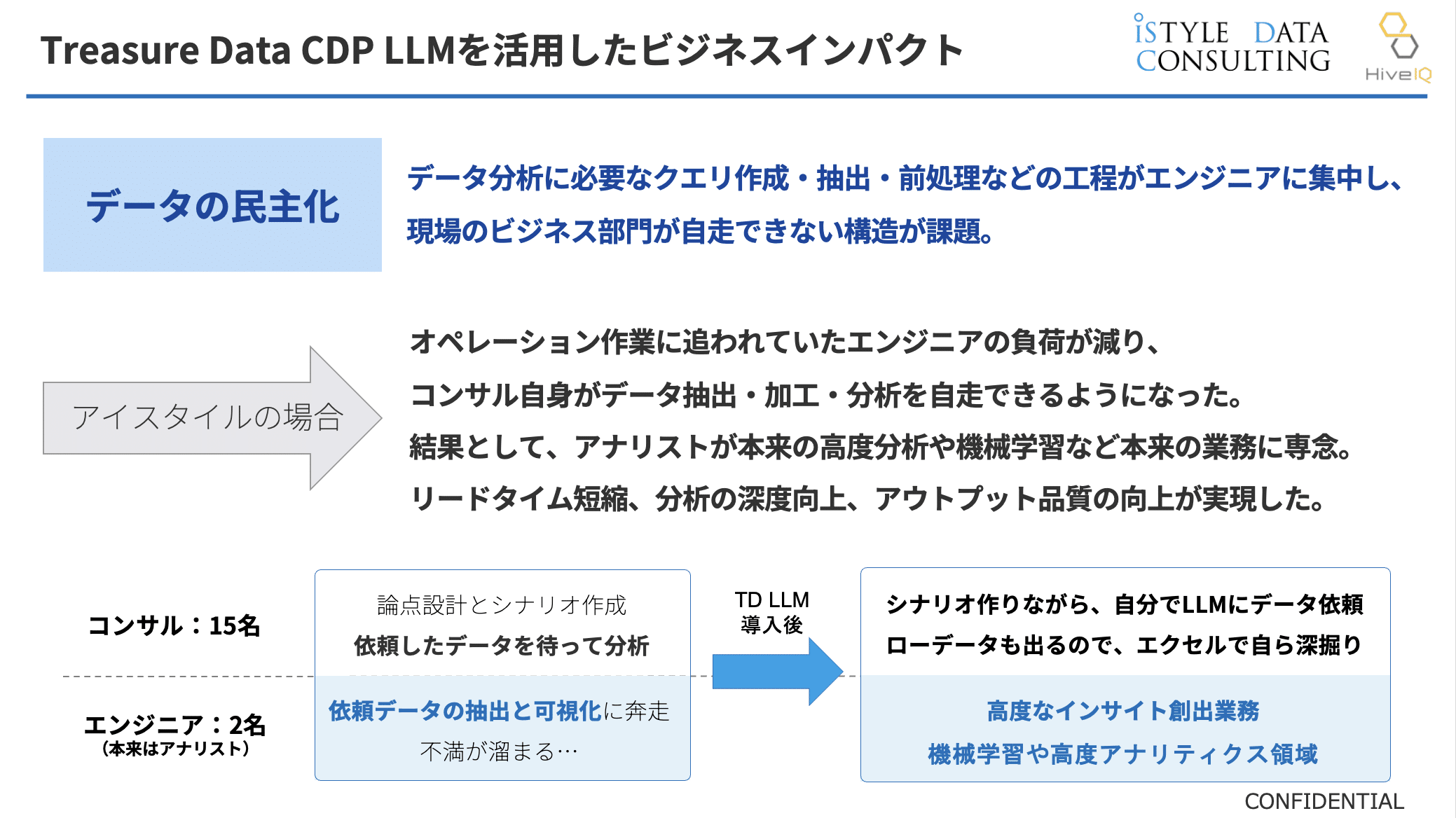 そのため同社は、非エンジニアのコンサルタントでもデータを扱える体制を目指し、トレジャーデータCDPを導入した。