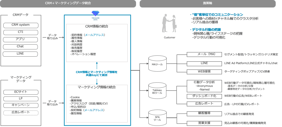 お客様対応における両輪であるマーケティング+CRMのデータ統合を実施することにより、お客様像の見える化やタッチポイントの改善に向けたデータ構築が可能となりますので、皆さまのご参考になれば嬉しく思います。