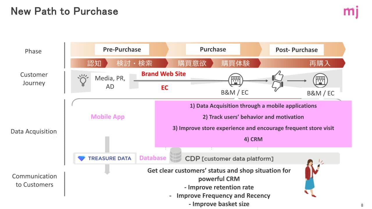 購買前の状況では、メディアでプロモーションを展開するなどして来店を促します。そして、来店された顧客にはアプリのダウンロードをお願いして、クーポンを発行したり、ポイントを付与したりします。そして、再購入いただいた際にポイントを付与するなど行い、これらのデータを全てTreasure Data CDPに格納します。