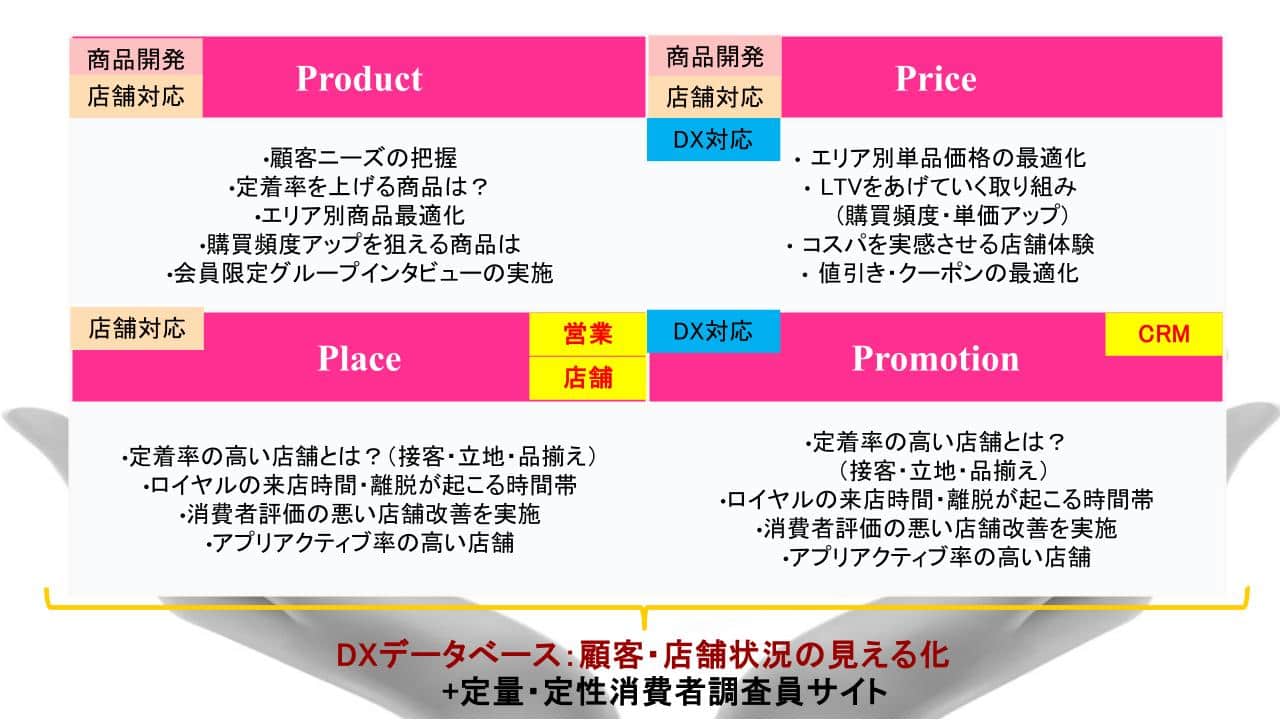 CDPをマーケティングのあらゆる領域で活用できる体制を整えて、かつ定量調査などリサーチした結果も踏まえて顧客の姿をより明確に可視化できたら、どこで・何を・いくらで販売するか、そのためにどのようなプロモーションを打って顧客との関係を構築するか最適化させます。