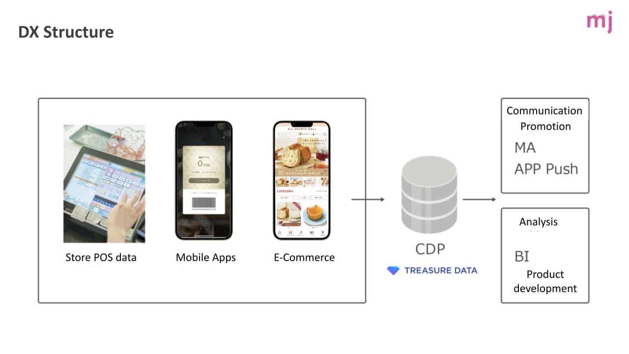 この食品会社は、店舗は数多くあるものの、店舗のPOSデータと顧客データを取得できていませんでした。いわゆる「レジを通過するだけだった」顧客の情報を取得するため、スマートフォンのアプリでポイントが貯まるようにしたり、Eコマースを最適化して顧客の行動を可視化したりするところから着手しました。