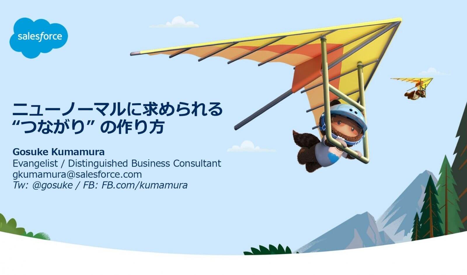 人々の生活様式が大きく変化したニューノーマルの世界の中で、企業も顧客もデジタルシフトが加速しました。同時に、顧客とのデジタル上でのコミュニケーションが当たり前になり、顧客の取り合いも進んでいます。顧客とのつながりを維持することは当然のことながら、新たな顧客とのつながりを作り長くつながることが求められます。株式会社セールスフォース・ドットコム 熊村 剛輔 氏が、新時代に求められる顧客とのつながりをツールを用いてどう実現するかについて紹介しました。