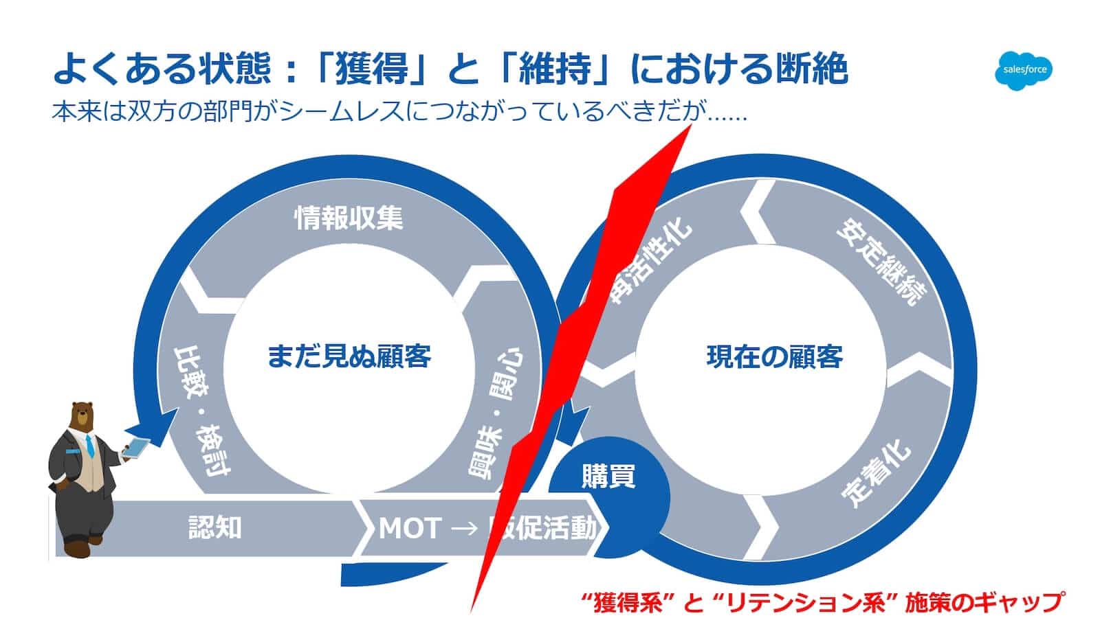 なぜかというと、この両者は担当する部門が違います。データも断絶していれば、部門も断絶しています。本来であれば既存顧客をロイヤル化させるためのKPIに則って、ライフタイムバリューを高めていきます。そのループにきちんと乗っかってくださったライフタイムバリューの高いお客様は、本来きちんと獲得していくべきお客様像です。しかし、実際のところ新規獲得は、断絶されがちです。新規獲得のためのオーディエンス像やKPIがバラバラになっていることは多々あります。