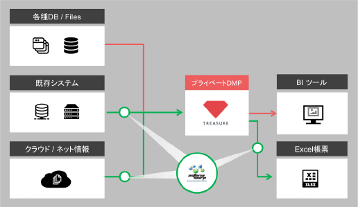 トレジャーデータサービスはクラウド型のデータマネジメントサービスで、各種データベースやファイルシステムからデータを抽出する機能とクラウド上に保存する機能をもっています。特に最近ではIoT(Internet of Things)の利活用を検討している企業が増加しており、大量のデータをクラウドで集計・管理できるトレジャーデータサービスへの注目も高まっています。しかし、日本の多くの企業では古くから使われてきたシステムや様々な他のクラウドサービスやインターネット上のデータを分析対象としたい要望が数多く存在しています。