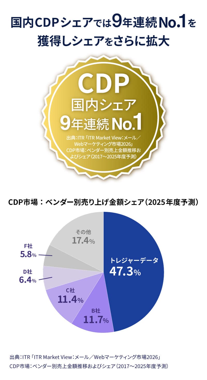 トレジャーデータ株式会社(本社:東京都港区、社長執行役員:三浦 喬、以下 トレジャーデータ)は、コンサルティング・調査会社である株式会社アイ・ティ・アール(以下、ITR)が2026年1月に発行した市場調査レポート「ITR Market View:メール/Webマーケティング市場2026」において、顧客データ活用サービス「Treasure Data CDP」が、国内CDP(カスタマーデータプラットフォーム)市場ベンダー別売上金額シェアで、2017年から2025年度(予測)において9年連続で第1位を獲得し、2025年度(予測)は47.3%であったことをお知らせします。